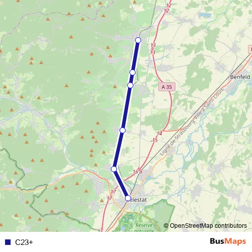 The first stop of the C23+ bus route is Barr and the last stop is Sélestat. C23+ is operational during en semaine.
