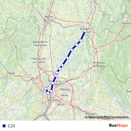 The first stop of the C23 rail route is Bourg-en-Bresse and the last stop is Lyon Vaise. C23 is operational during tous les jours.