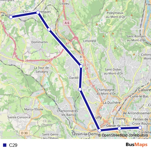 The first stop of the C29 bus route is Lozanne and the last stop is Lyon Gorge de Loup. C29 is operational during tous les jours.