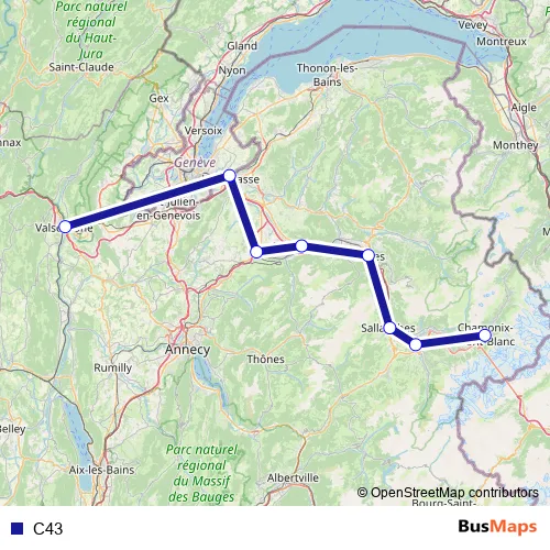 The first stop of the C43 bus route is Bellegarde-sur-Valserine and the last stop is Chamonix-Mont-Blanc. C43 is operational during tous les jours.