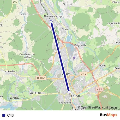 The first stop of the C43 bus route is Thaon and the last stop is Épinal. C43 is operational during en semaine.