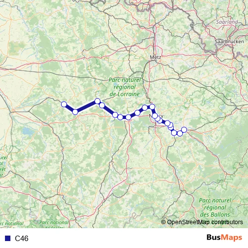 The first stop of the C46 rail route is Lunéville and the last stop is Bar-le-Duc. C46 is operational during tous les jours.