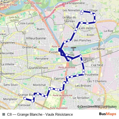 The first stop of the C8 trolleybus route is Vaulx - Résistance and the last stop is Grange Blanche. C8 (Grange Blanche - Vaulx Résistance) is operational during tous les jours.