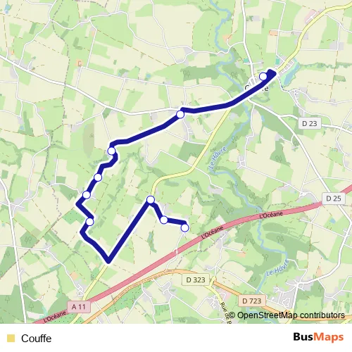 The first stop of the Couffe bus route is Gruere and the last stop is Écoles - Couffe. Couffe is operational during tous les jours.