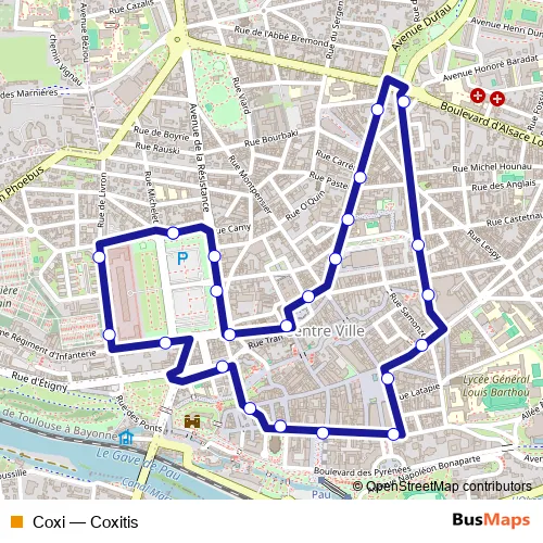 The first stop of the Coxi bus route is Pl. Verdun Camou and the last stop is Pl. Verdun Camou. Coxi (Coxitis) is operational during tous les jours.