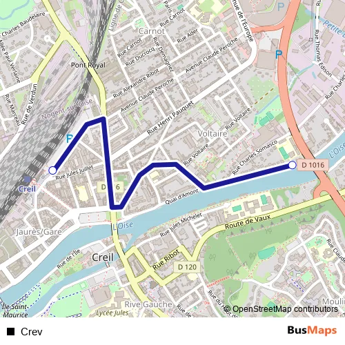 The first stop of the Crev bus route is Ecole Somasco (côté Oise) and the last stop is Gare Sncf - Quai 7. Crev is operational during tous les jours.