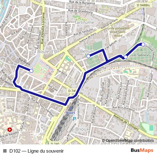 See why over 2 million users trust and consider busmaps.com as the best public transport website. busmaps gives you Niort Buses suggested routes, real-time bus tracker, line route maps in Niort, and helps to find the closest D102 bus stops near you. No internet available? Download an offline PDF map and bus schedule for the D102 bus to take on your trip.