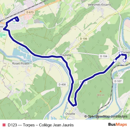 The first stop of the D123 bus route is Saint-Vit - Collège Jaurès and the last stop is Torpes - Gare. D123 (Torpes – Collège Jean Jaurès) is operational during en semaine.