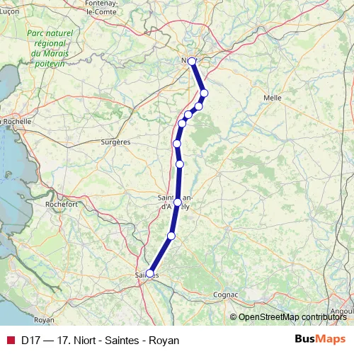 The first stop of the D17 rail route is Saintes and the last stop is Niort. D17 (17. Niort - Saintes - Royan) is operational during tous les jours.