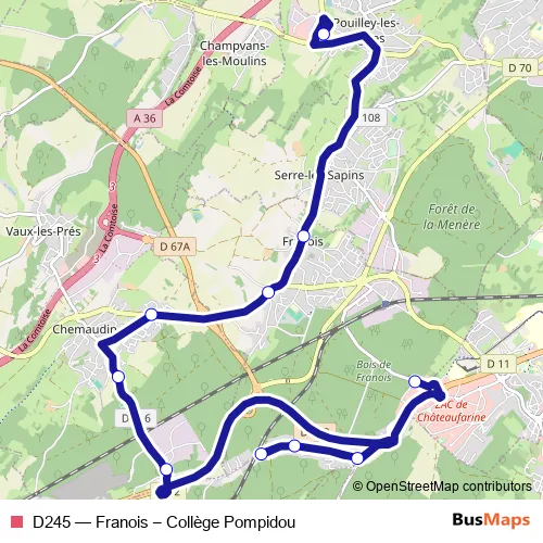 The first stop of the D245 bus route is Pouilley-les-Vignes - Collège Pompidou and the last stop is Franois - Quatre Journaux. D245 (Franois – Collège Pompidou) is operational during en semaine.