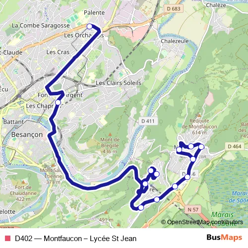 See why over 2 million users trust and consider busmaps.com as the best public transport website. busmaps gives you Besancon Buses suggested routes, real-time bus tracker, line route maps in Besancon, and helps to find the closest D402 bus stops near you. No internet available? Download an offline PDF map and bus schedule for the D402 bus to take on your trip.