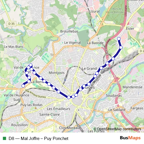 See why over 2 million users trust and consider busmaps.com as the best public transport website. busmaps gives you Limoges Buses suggested routes, real-time bus tracker, line route maps in Limoges, and helps to find the closest D8 bus stops near you. No internet available? Download an offline PDF map and bus schedule for the D8 bus to take on your trip.