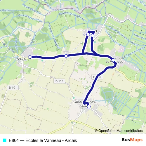 The first stop of the E864 bus route is LE Vanneau Ecole and the last stop is Saint Georges DE REX Champ DE Foire. E864 (Écoles le Vanneau - Arcais) is operational during tous les jours.