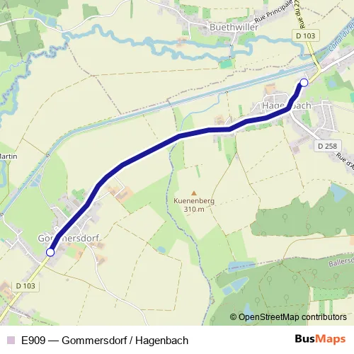 The first stop of the E909 bus route is Gommersdorf - Ecole and the last stop is Gommersdorf - Ecole. E909 (Gommersdorf / Hagenbach) is operational during tous les jours.