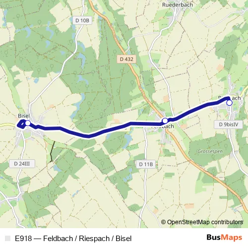 The first stop of the E918 bus route is Riespach - Mairie and the last stop is Riespach - Mairie. E918 (Feldbach / Riespach / Bisel) is operational during tous les jours.