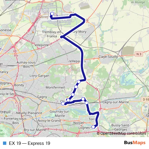 The first stop of the EX 19 bus route is Roissypole - Aéroport Cdg1 (G2) and the last stop is Gare de Torcy. EX 19 (Express 19) is operational during tous les jours.