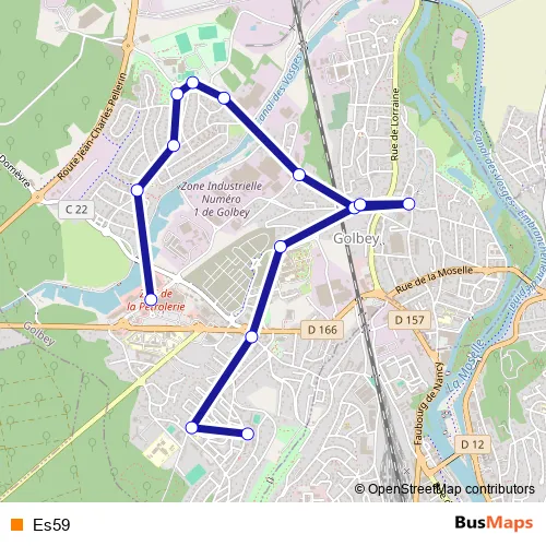 The first stop of the Es59 bus route is Golbey C Cial and the last stop is Golbey La Fontaine - Aller. Es59 is operational during tous les jours.