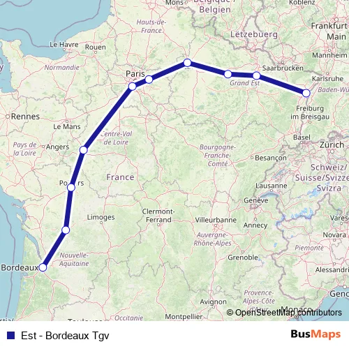 The first stop of the Est - Bordeaux Tgv rail route is Bordeaux Saint-Jean and the last stop is Strasbourg. Est - Bordeaux Tgv (Est - Bordeaux Tgv) is operational during tous les jours.