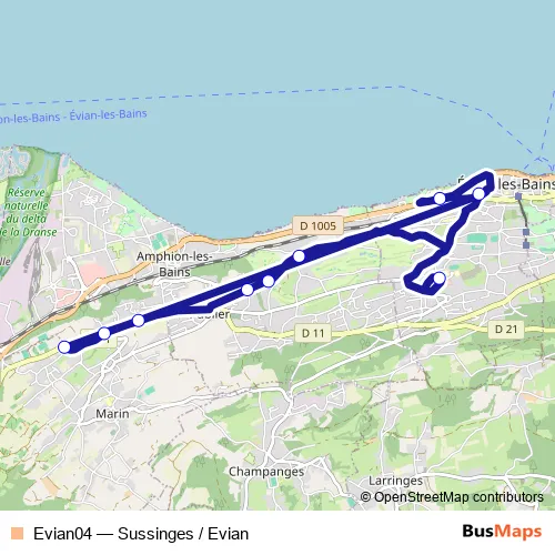 The first stop of the Evian04 bus route is Sussinges and the last stop is Collège Saint-Bruno. Evian04 (Sussinges / Evian) is operational during en semaine.