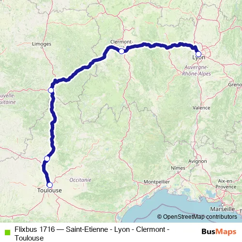 The first stop of the Flixbus 1716 bus route is Lyon (Gerland Bus Station) and the last stop is Toulouse (Central Bus Station Pierre Sémard). Flixbus 1716 (Saint-Etienne - Lyon - Clermont - Toulouse) is operational during tous les jours.