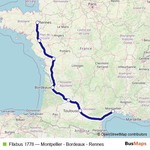 Click here to view the nearest Flixbus 1778 - Montpellier - Bordeaux - Rennes bus stop.