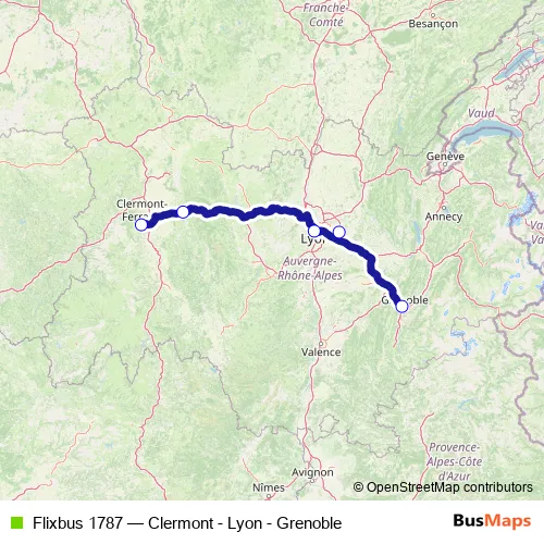 The first stop of the Flixbus 1787 bus route is Grenoble (Central Bus Station) and the last stop is Clermont-Ferrand (Bus Station). Flixbus 1787 (Clermont - Lyon - Grenoble) is operational during tous les jours.