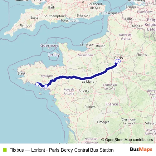 The first stop of the Flixbus bus route is Paris Gare de Bercy Seine and the last stop is Lorient Bus Stop. Flixbus (Lorient - Paris Bercy Central Bus Station) is operational during tous les jours.
