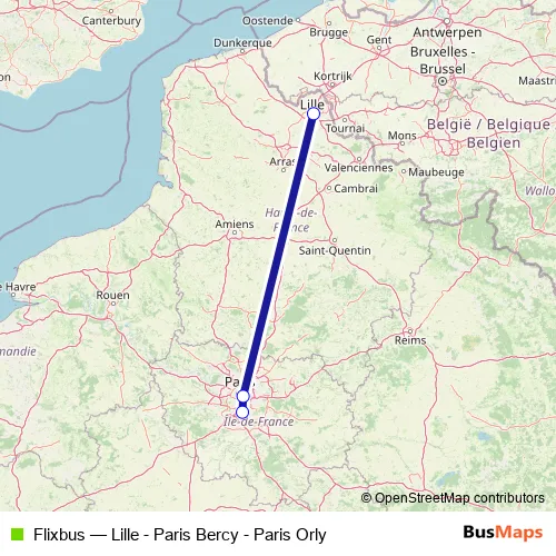 The first stop of the Flixbus bus route is Lille and the last stop is Paris Orly Airport, Paris - Orly Airport. Flixbus (Lille - Paris Bercy - Paris Orly) is operational during tous les jours.