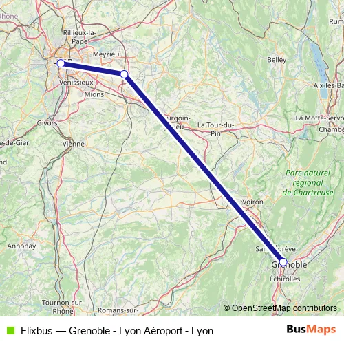 The first stop of the Flixbus bus route is Grenoble and the last stop is Lyon, Lyon Perrache. Flixbus (Grenoble - Lyon Aéroport - Lyon) is operational during le week-end.
