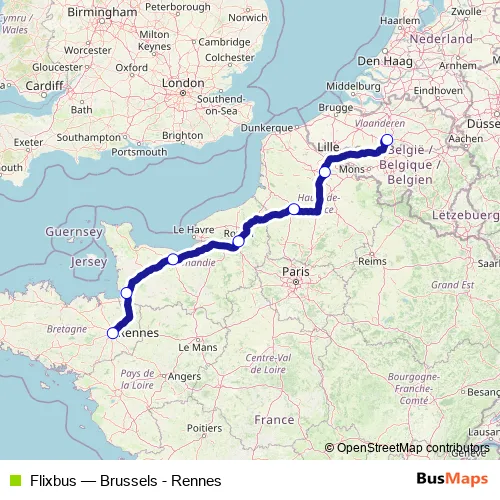 The first stop of the Flixbus bus route is Rennes Bus Station and the last stop is Brussels North. Flixbus (Brussels - Rennes) is operational during tous les jours.