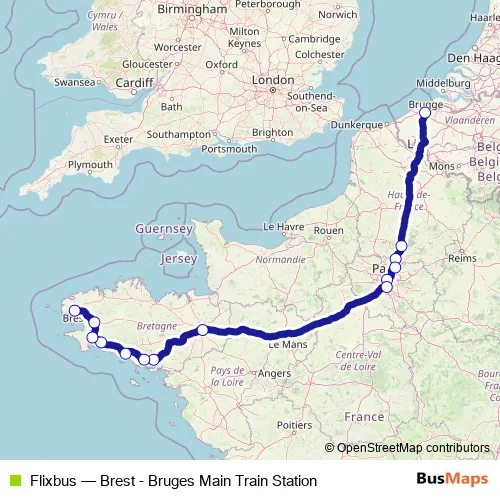 The first stop of the Flixbus bus route is Bruges N342 and the last stop is Brest Rond Henri Rol-Tanguy. Flixbus (Brest - Bruges Main Train Station) is operational during tous les jours.