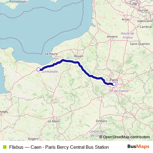 The first stop of the Flixbus bus route is Caen Bus Station and the last stop is Paris Gare de Bercy Seine. Flixbus (Caen - Paris Bercy Central Bus Station) is operational during tous les jours.