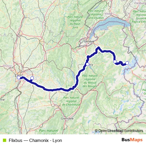 The first stop of the Flixbus bus route is Chamonix Sud Bus Station and the last stop is Lyon Av. Tony Garnier. Flixbus (Chamonix - Lyon) is operational during tous les jours.
