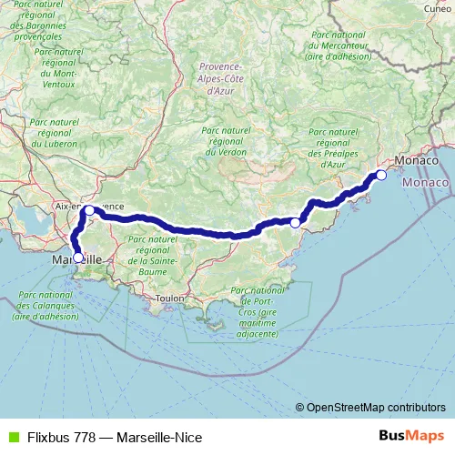 The first stop of the Flixbus 778 bus route is Nice Airport (Bus Station - Terminal 1) and the last stop is Marseille (Saint-Charles). Flixbus 778 (Marseille-Nice) is operational during tous les jours.