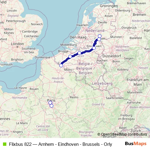 The first stop of the Flixbus 822 bus route is Paris - Orly Airport and the last stop is Arnhem Central Station (Sonsbeekzijde). Flixbus 822 (Arnhem - Eindhoven - Brussels - Orly) is operational during tous les jours.