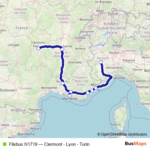 The first stop of the Flixbus N1719 bus route is Clermont-Ferrand (Bus Station) and the last stop is Turin (Vittorio Emanuele). Flixbus N1719 (Clermont - Lyon - Turin) is operational during tous les jours.