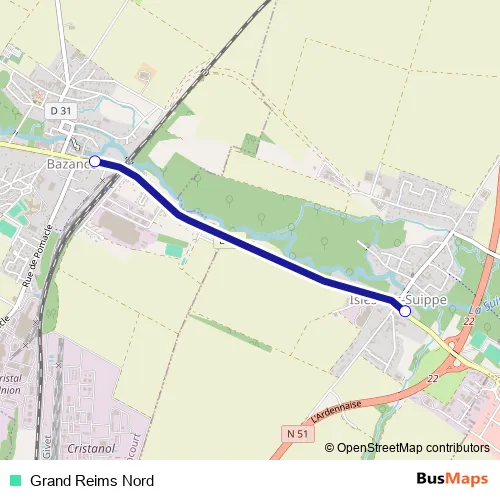 The first stop of the Grand Reims Nord bus route is Isles - sur - Suippe and the last stop is Bazancourt vers Boult. Grand Reims Nord is operational during en semaine.