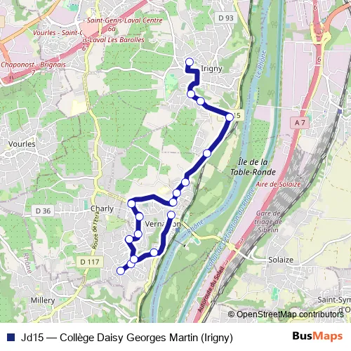 The first stop of the Jd15 bus route is Vernaison place and the last stop is Collège D.G.Martin. Jd15 (Collège Daisy Georges Martin (Irigny)) is operational during en semaine.