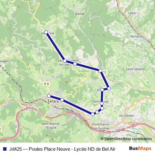 The first stop of the Jd425 bus route is Valsonne Place Neuve and the last stop is Tarare Collège ND de Bel Air. Jd425 (Poules Place Neuve - Lycée ND de Bel Air) is operational during en semaine.