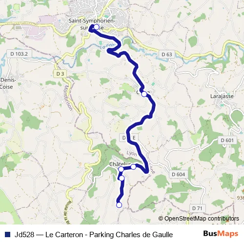 The first stop of the Jd528 bus route is St-Symphorien - Pkg Cdg and the last stop is Chatelus - Le Carteron. Jd528 (Le Carteron - Parking Charles de Gaulle) is operational during en semaine.