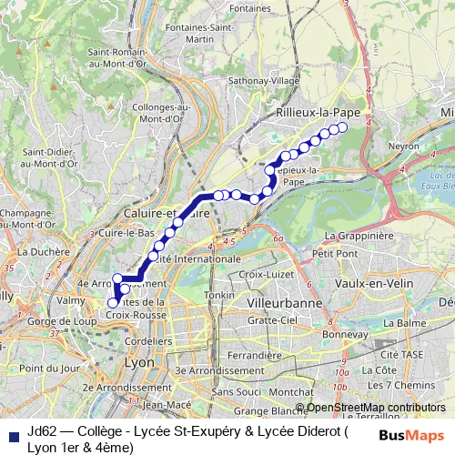 The first stop of the Jd62 bus route is Rillieux Semailles and the last stop is Collège J.B. de la Salle. Jd62 (Collège - Lycée St-Exupéry & Lycée Diderot (Lyon 1er & 4ème)) is operational during en semaine.