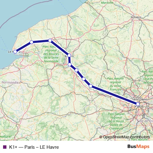 The first stop of the K1+ rail route is Le Havre and the last stop is Paris Saint-Lazare. K1+ (Paris – LE Havre) is operational during tous les jours.