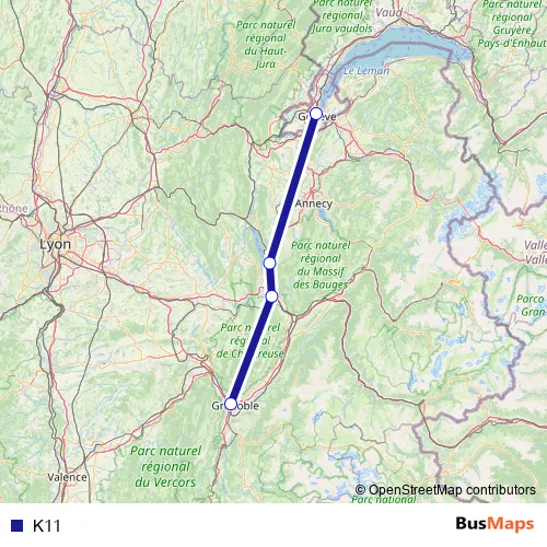 The first stop of the K11 bus route is Genève and the last stop is Grenoble-Gare-Routière. K11 is operational during tous les jours.