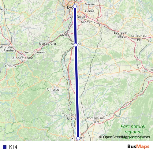 The first stop of the K14 bus route is Lyon-Part-Dieu Gare Routière and the last stop is Valence Gare Routière. K14 is operational during tous les jours.