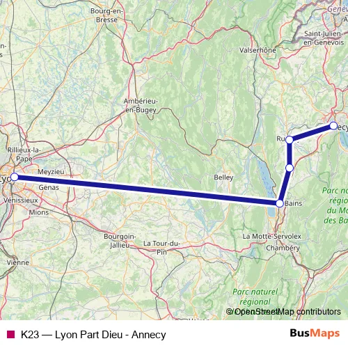 The first stop of the K23 rail route is Annecy and the last stop is Lyon-Part-Dieu Gare Routière. K23 (Lyon Part Dieu - Annecy) is operational during tous les jours.