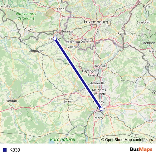 The first stop of the K839 bus route is Metz Ville and the last stop is Longwy. K839 is operational during tous les jours.