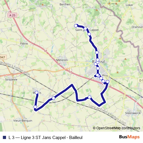The first stop of the L 3 bus route is Merris - Eglise and the last stop is Saint-Jans-Cappel - LE Schaexhen. L 3 (Ligne 3 ST Jans Cappel - Bailleul) is operational during tous les jours.