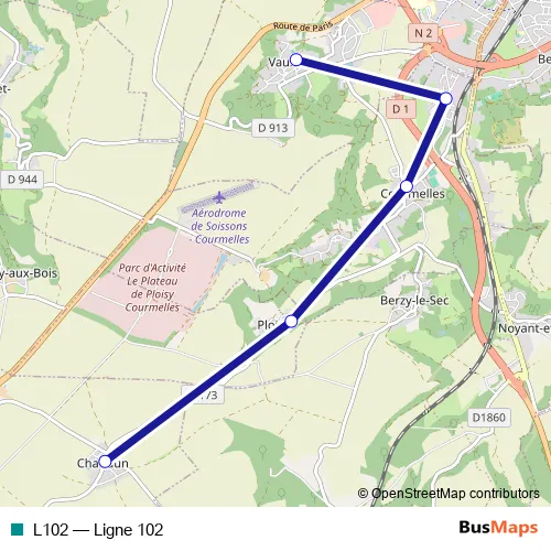 The first stop of the L102 bus route is Chaudun-Place Bernard Aubert and the last stop is Vauxbuin-Ecole. L102 (Ligne 102) is operational during tous les jours.