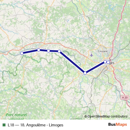The first stop of the L18 rail route is Limoges Bénédictins and the last stop is Saillat - Chassenon. L18 (18. Angoulême - Limoges) is operational during tous les jours.