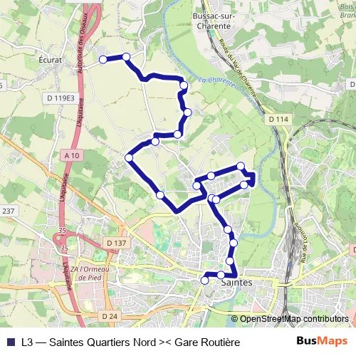 See why over 2 million users trust and consider busmaps.com as the best public transport website. busmaps gives you Saintes Buses suggested routes, real-time bus tracker, line route maps in Saintes, and helps to find the closest L3 bus stops near you. No internet available? Download an offline PDF map and bus schedule for the L3 bus to take on your trip.